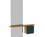 Materiaali: Massiivitammi, maalattu MDF, peililasi, messinginvärinen teräs, tummanruskea keinonahka