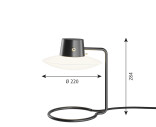 AJ Oxford -bordslampan finns i två olika höjder, 280 eller 410 mm, med eller utan överskärm i metall. Lampan avger ett behagligt nedåtriktat ljus, som harmoniskt belyser ytan under den genom det munblåsta, mjölkvita opalglaset. Varianten utan överskärm i metall ger ett ytterligare mjukt sken uppåt och bildar en behaglig halo runt armaturen.