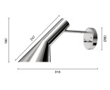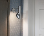 Vägglampan ger ett direkt, nedåtriktat ljus. Det vippbara armaturhuvudet kan justeras i sidled för att optimera ljusfördelningen. Skärmen är vitmålad på insidan vilket ger ljuset en mjuk och behaglig spridning.