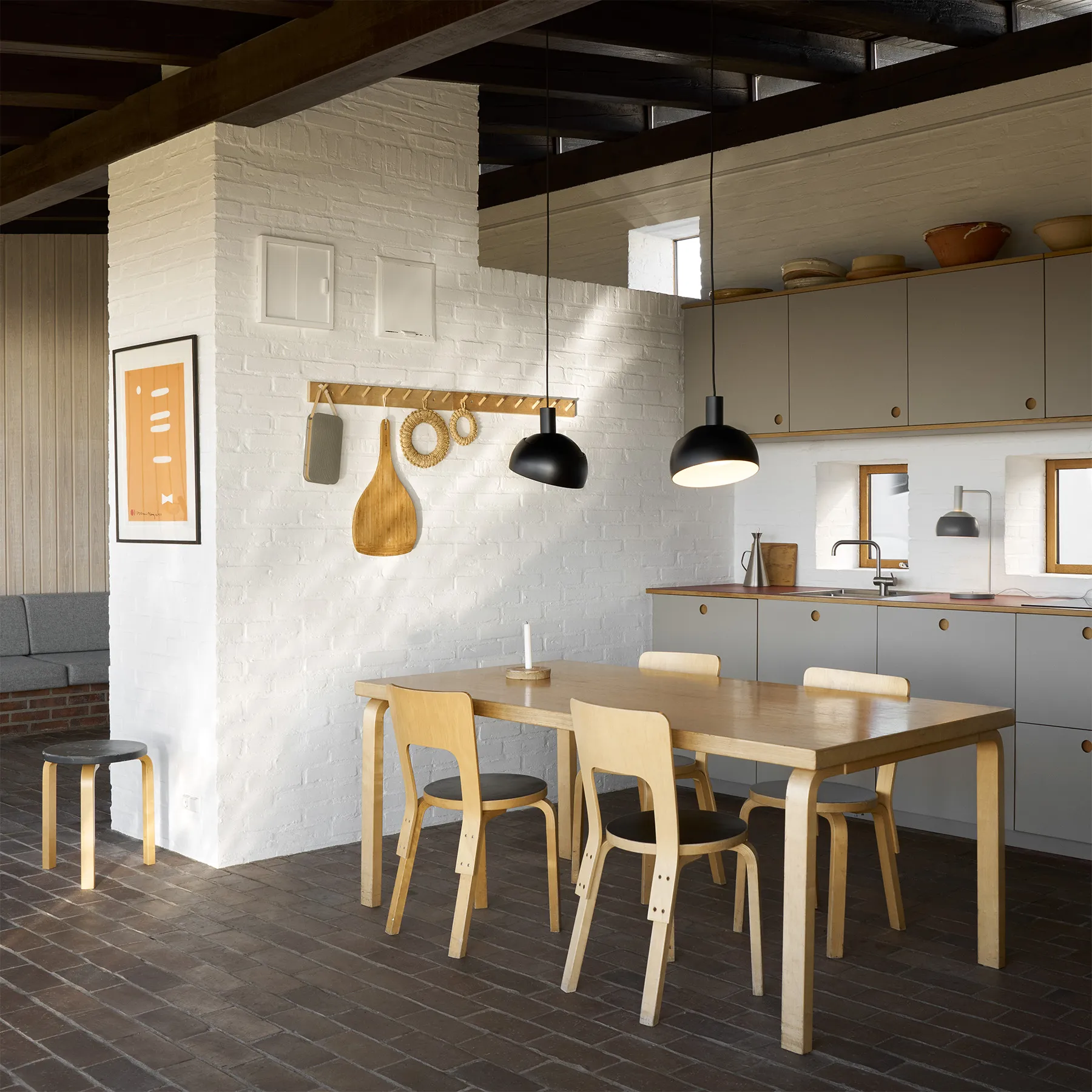 FJ Elements är en pendel formgiven av Finn Juhl med en karakteristisk tvåskärmskonstruktion. Ljuset riktas nedåt genom diffusorn utan att blända, samtidigt som en öppning mellan skärm och lamphus ger en subtil uppåtriktad belysning.