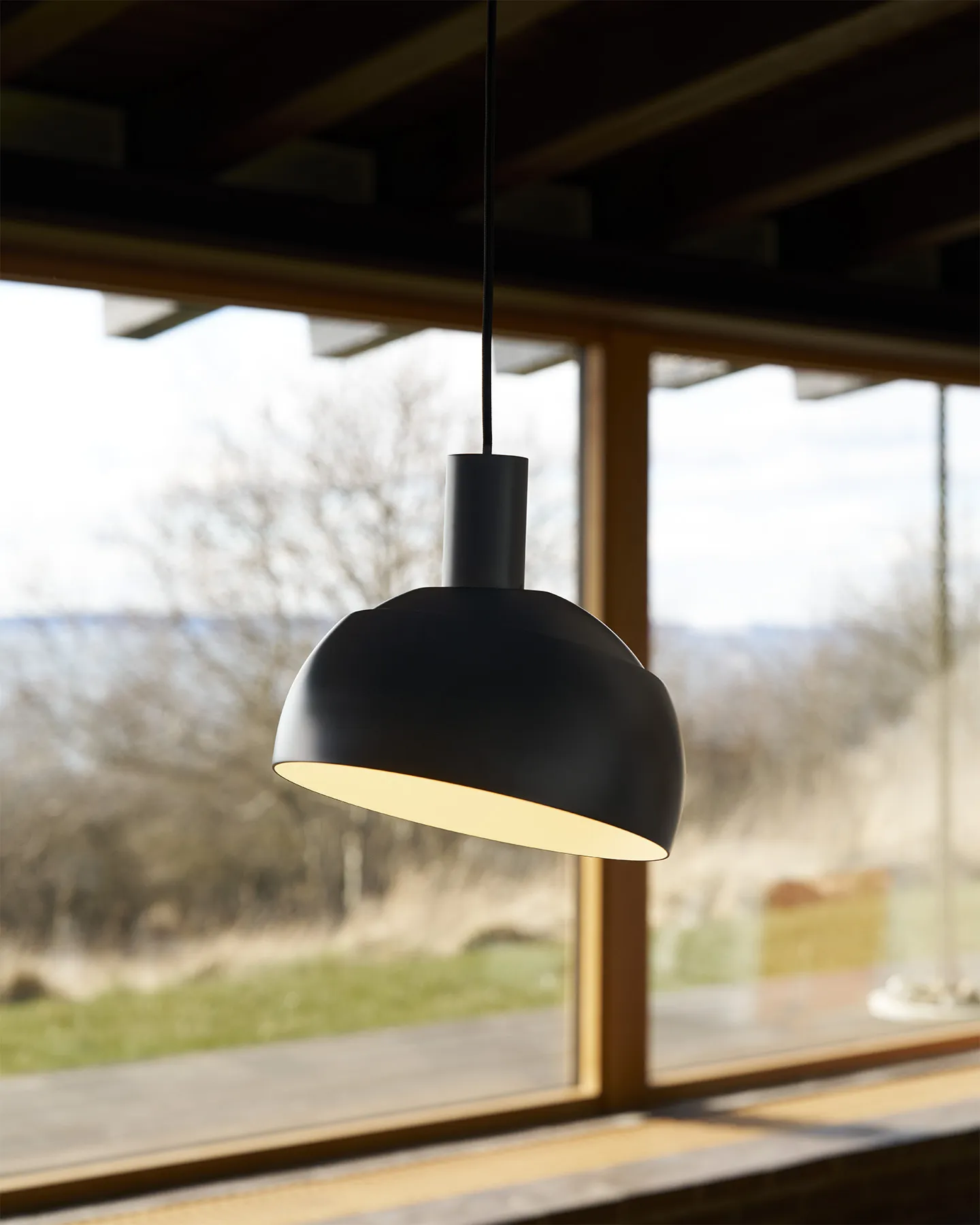 Lampan bygger på två skärmar i aluminium där den nedre kan roteras runt den övre. På så vis kan ljuset riktas och justeras efter behov, samtidigt som en öppning i konstruktionen tillför en mjuk ljusglimt uppåt. Kombinationen av nedåtriktat och indirekt ljus ger ett behagligt helhetsintryck utan bländning.