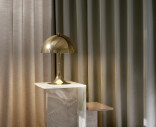 Versionen i mässing med metallskärm riktar ljuset direkt nedåt och skapar en mjuk och behaglig belysning tack vare den vitmålade innerskärmen och reflektionen från det trumpetformade stativet.