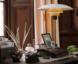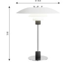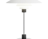 Färg/material: Skärmar i vit pulverlackerad aluminium. Lampfot och stativ: högglansförkromad mässing och stål, svart formgjuten bakelit.