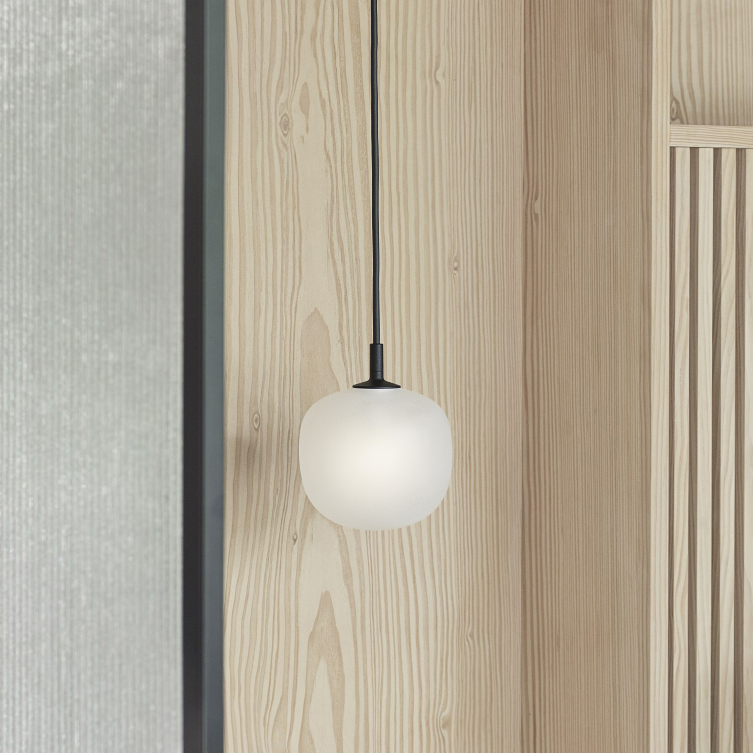 Rime Pendant Lamp är en sofistikerad pendel med ett halvmatt, sandblästrat glas. Designen har en karakteristisk form inspirerad av ekollon, och passar in i alla rum, från köket till sovrummet. Den minimalistiska Rime har en vacker detalj i lampans pulverlackerade övre del och en sladd i samma färg.