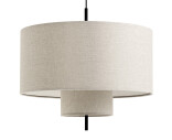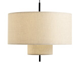 Lampan bygger på enkla former men bjuder på lager – bokstavligt och visuellt. Ljuset silas genom två skärmar i linne och sprids jämnt i rummet, medan den centrala ståldetaljen ger stabilitet och gör att formen upplevs både luftig och tydlig.