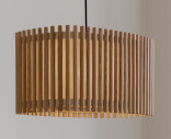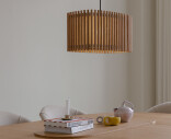 Komorebi är ett japanskt ord för solljus som skiner genom trädens löv, vilket beskriver denna lampskärm, gjord av trälameller och textil, väl. Kombinationen av trädetaljer och textil hjälper till att jorda hemmet och gör miljön lugn och upplyftande.
