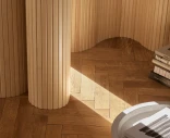 Skärmvägg 100B i höjd 150 cm är den mest kända versionen av Alvar Aaltos vågformade design från 1936. Den fungerar som rumsavdelare och kan användas som bakgrund till en möbelgrupp.