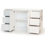 Alla lådor är utrustade med soft-close-funktion och dolda kullagrade skenor för en smidig användning. Dörrarna till skåpet öppnas var för sig åt höger och vänster, också med mjukstängning. Möbeln vilar på tre separata socklar, varav två smala och en bred, vilket ger en upphöjd och balanserad känsla.