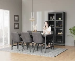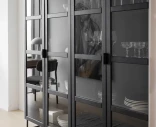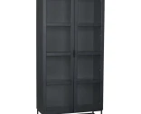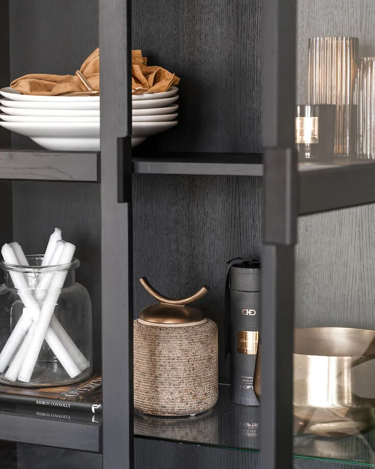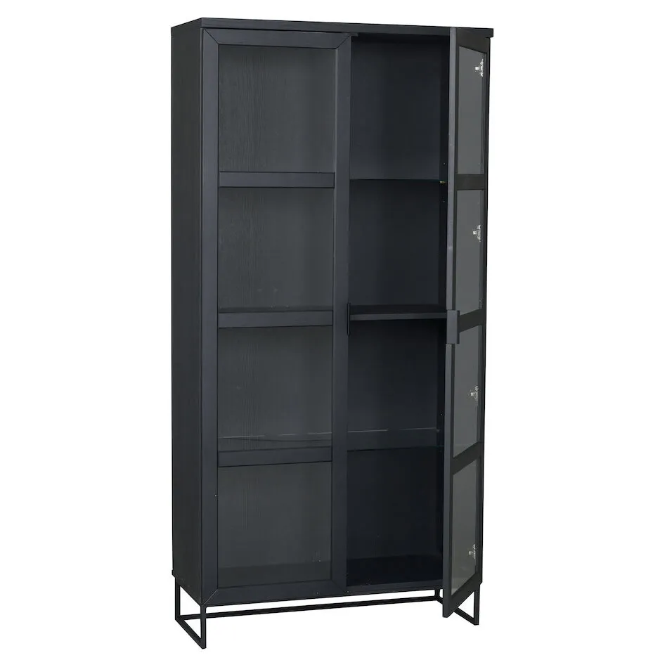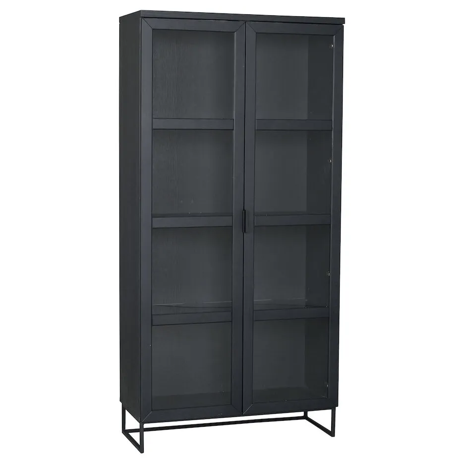 Everett är ett vitrinskåp i svartlackad ek med ett uttryck som känns både modernt och gediget. De stora glasdörrarna, den svarta träytan och metallunderredet ger skåpet en tydlig karaktär – samtidigt som formen är luftig och lättplacerad.