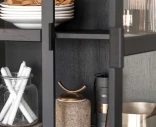 Dörrarna har mjukstängande funktion för en tyst och följsam öppning och stängning. Underredet i svart pulverlackerad metall ger stabilitet och ett lätt lyft från golvet, och de justerbara fötterna gör det enkelt att få skåpet att stå rakt även på ojämna underlag.