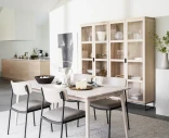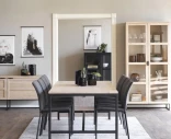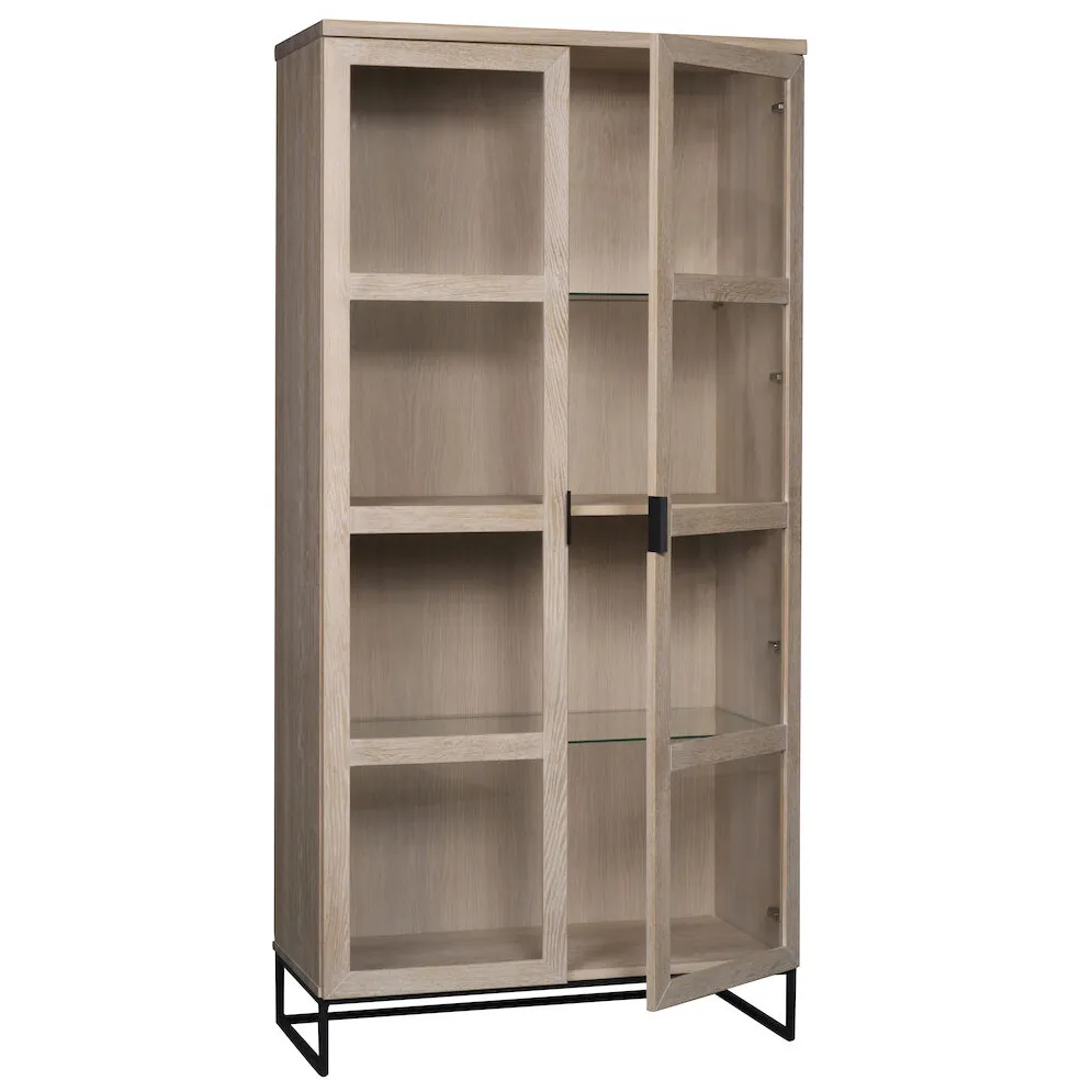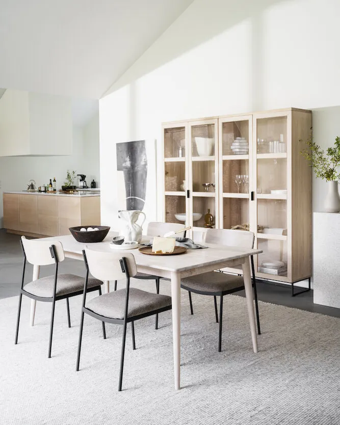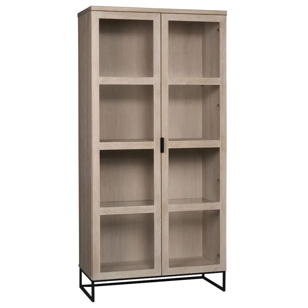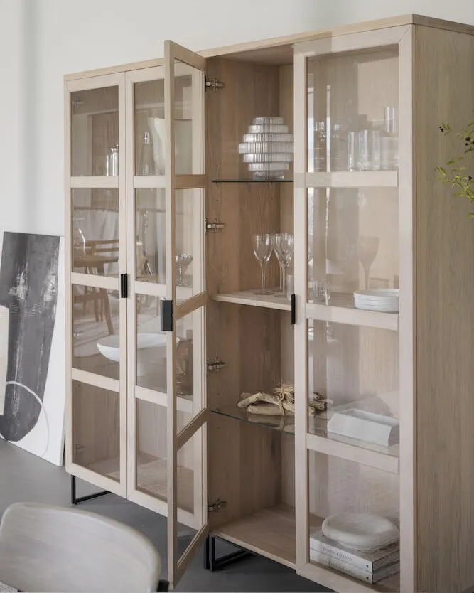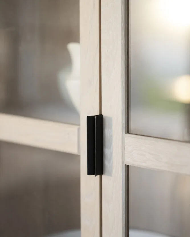 Everett är ett vitrinskåp i vitpigmenterad, borstad ek som kombinerar lätthet och karaktär. Den ljusa träytan framhäver ådringen på ett naturligt sätt, medan glasdörrarna och underredet i svart metall ger skåpet en modern balans. Ett luftigt och praktiskt förvaringsskåp som lyfter rummet utan att ta över.