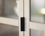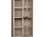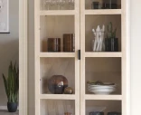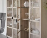 Bakom de två glasdörrarna finns tre hyllplan, varav två är flyttbara. Det gör det enkelt att anpassa skåpet efter det du vill visa upp: vackert porslin, favoritglas eller dekorationer. Hyllplanen är i glas och trä, vilket ger en fin variation i uttrycket.