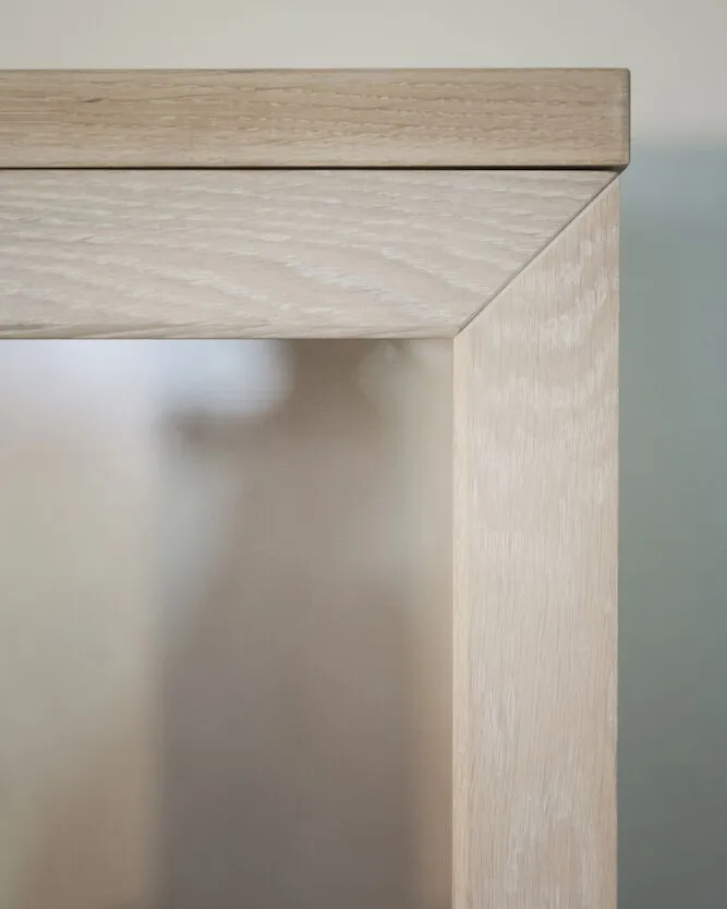 Everett vitrinskåp är tillverkat i vitpigmenterad, borstad och lackad massiv ek – ett uttryck som ger möbeln en ljus och naturlig känsla. Variationer och kvistar i träet får synas och bidrar till ett mer autentiskt och levande utseende.