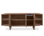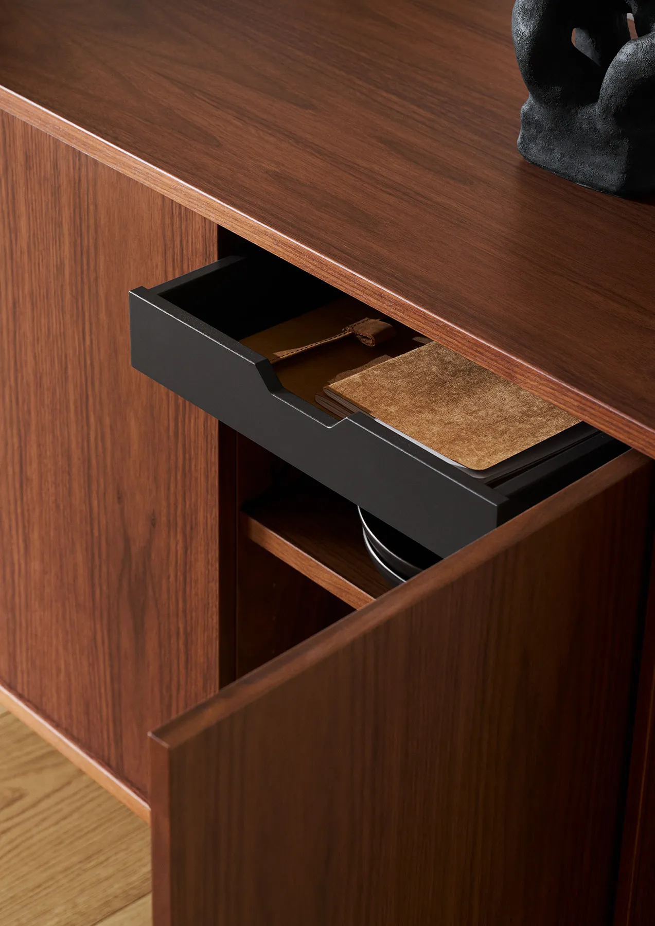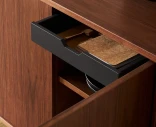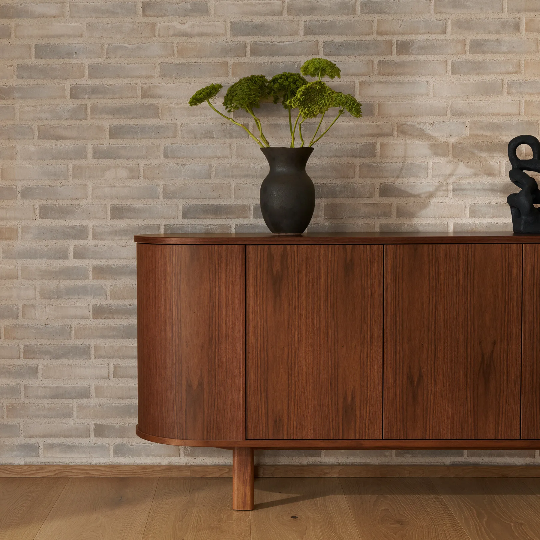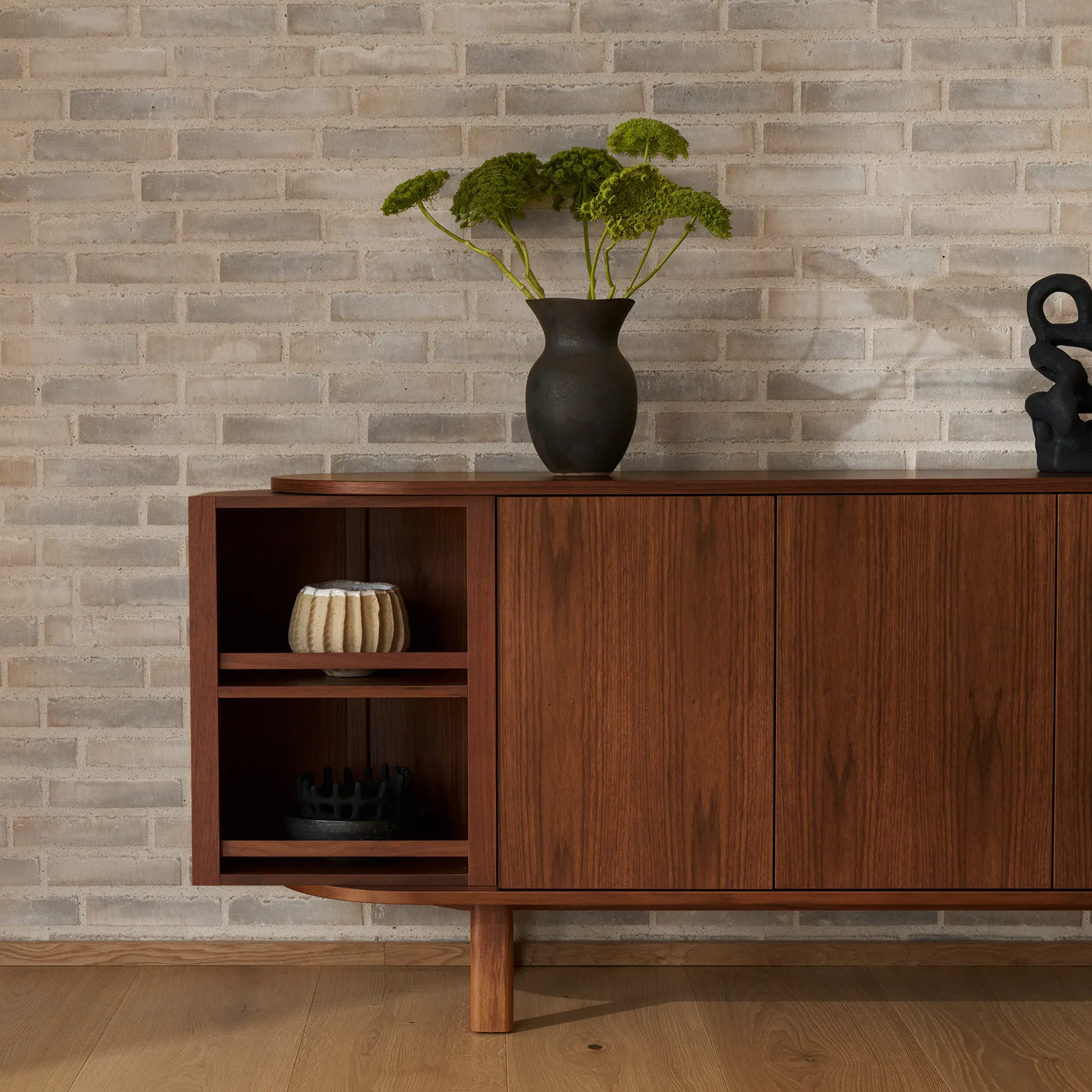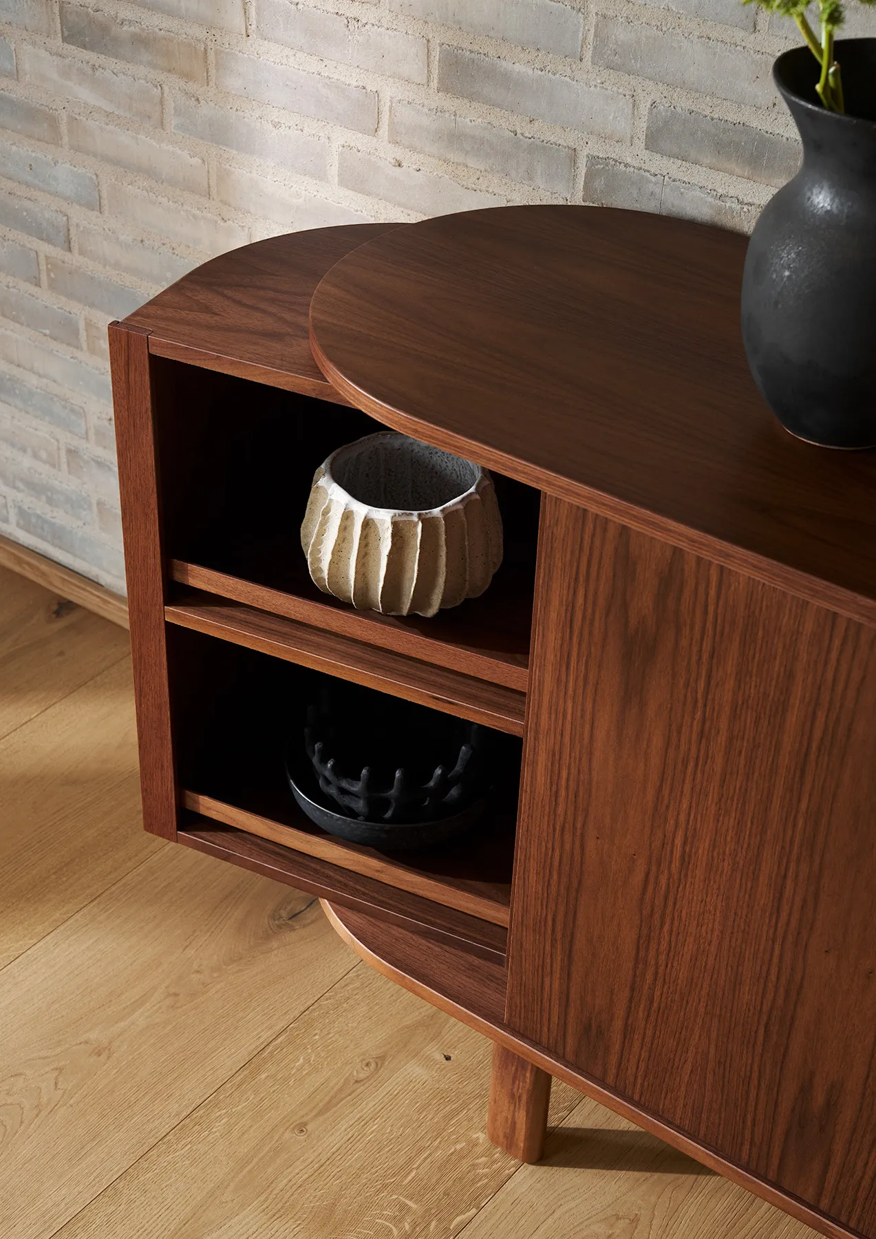 Formgiven av Per Hånsbæk förenar #543 det organiska och enkla med ett välplanerat inre. Skänken står på smäckra ben som ger ett lätt uttryck och gör att möbeln kan placeras fritt i rummet. I varje hörn finns en roterande modul som ger snabb tillgång till innehållet och samtidigt blir en elegant detalj. Tillsammans med tre dörrar, en låda, en lång hylla och tre kortare hyllor erbjuder skänken en genomtänkt förvaring som passar både vardagsporslin och mindre ting som behöver sin plats.