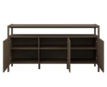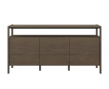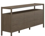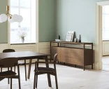 #713 är formgiven med mjuka linjer och genomtänkta detaljer. Överst finns en öppen hylla som passar för allt från keramik och böcker till belysning, medan de tre dörrarna döljer generösa förvaringsutrymmen med hyllplan för porslin, textilier eller andra vardagsföremål. De integrerade handtagen ger ett stilrent och minimalistiskt uttryck, medan den massiva träramen tillför både styrka och hantverkskänsla.