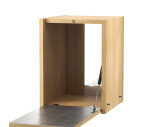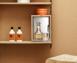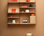Tiny Cabinet är ett exklusivt litet snapsskåp med klaffdörr som öppnas uppifrån ner. Skåpet passar till String System -seriens 30 cm djupa gavlar. Skåpet måste placeras ovanpå ett trähyllplan eller ett skåp och fästas i en av trådgavlarna. Insidan av skåpsdörren är klädd i en borstad rostfri plåt. Insidan av den bakre väggen är klädd i spegelglas.