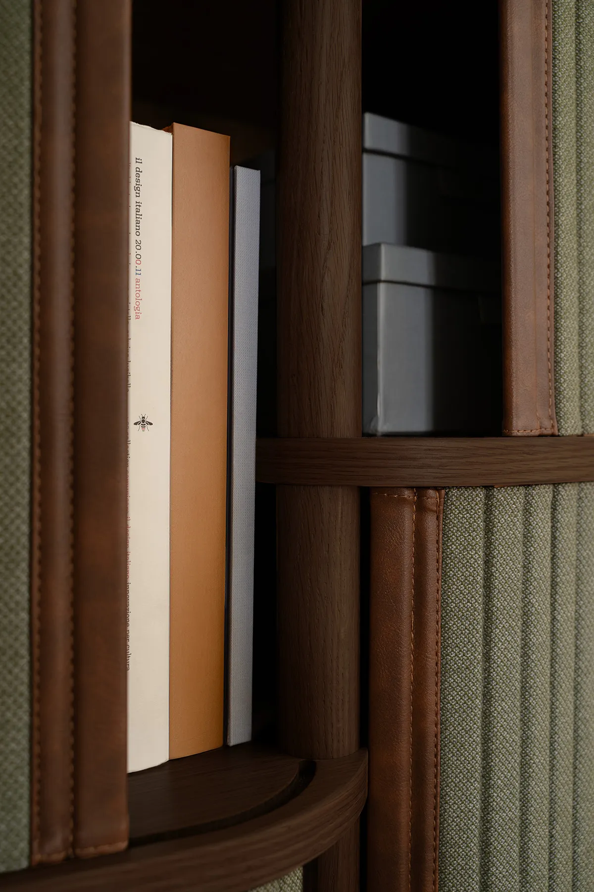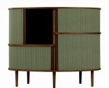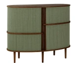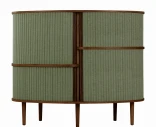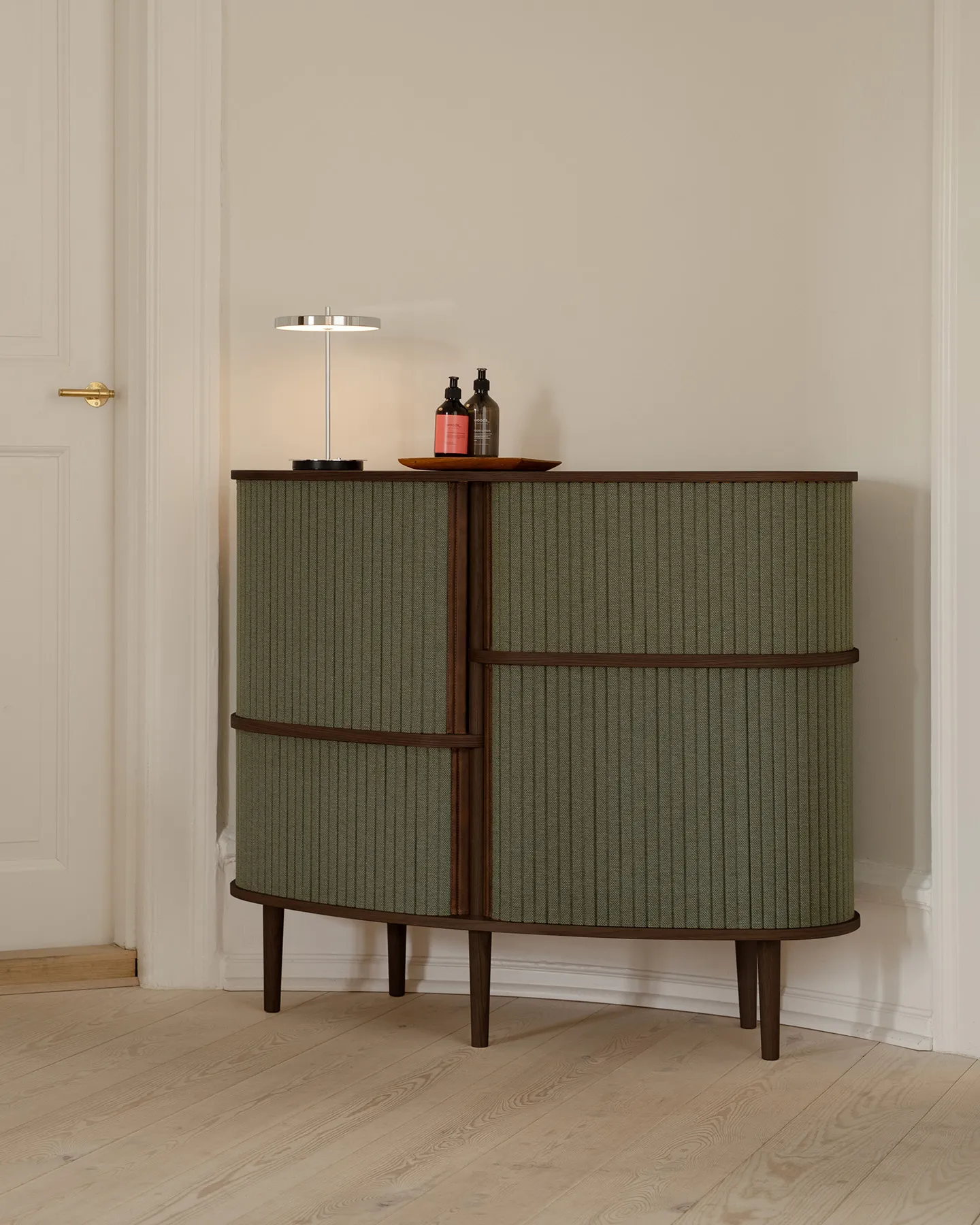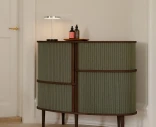 Audacious Highboard är en högre skänk med generös förvaring och böjda skjutdörrar i tyg. En funktionell möbel med varm karaktär – idealisk för matsal, vardagsrum eller hemmakontor.