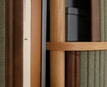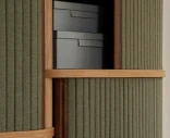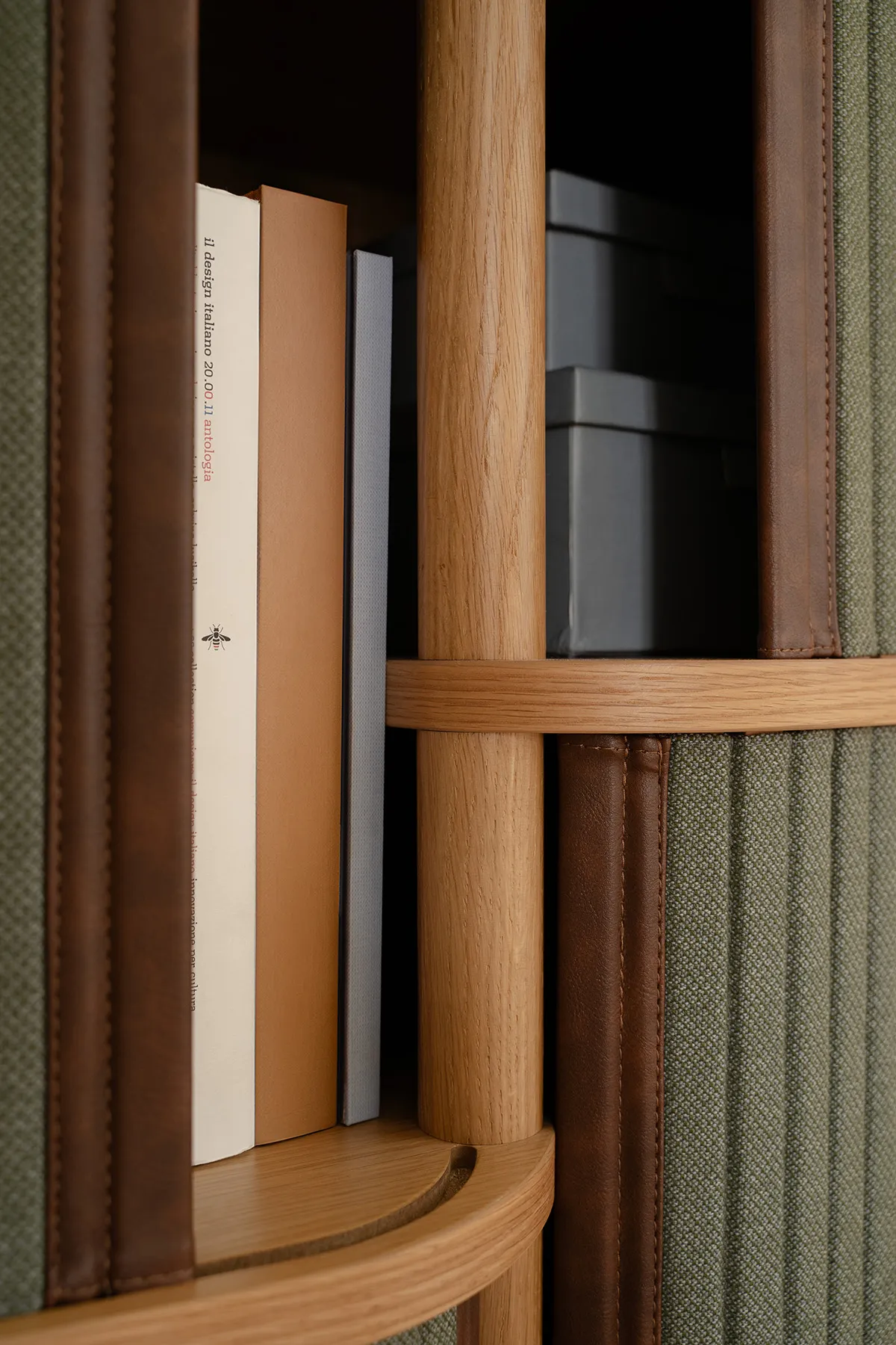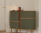 De rundade skjutdörrarna i Horizons-textil glider längs hela möbelns front och kan placeras där du vill ha dem – en flexibel lösning för både dekoration och dold förvaring. Dörrarna är klädda i ett tyg tillverkat av 100 % återvunnen polyester och är certifierade enligt OEKO-TEX® och GRS. Om du vill förändra uttrycket kan dörrarna enkelt bytas ut.