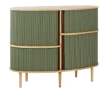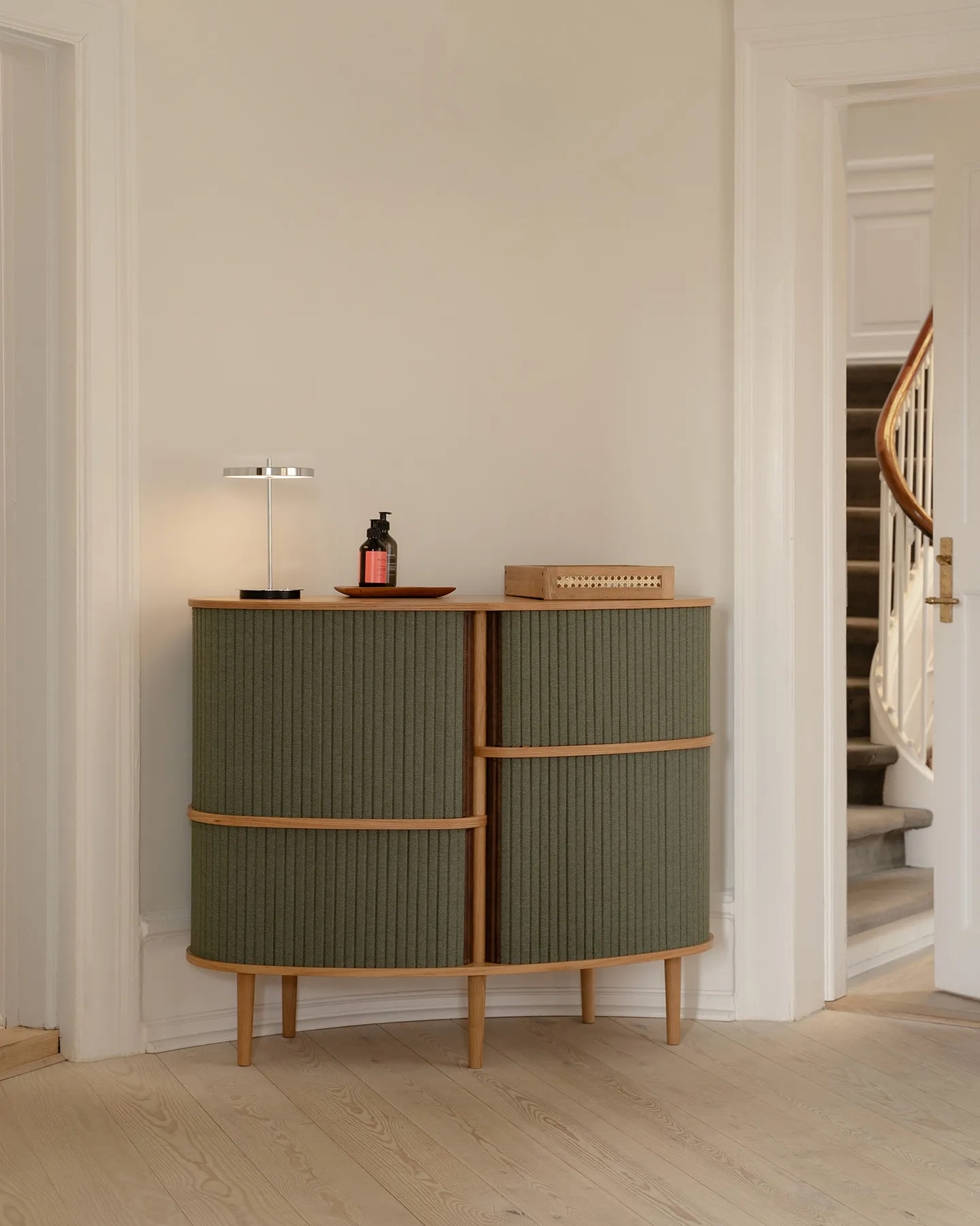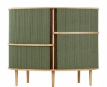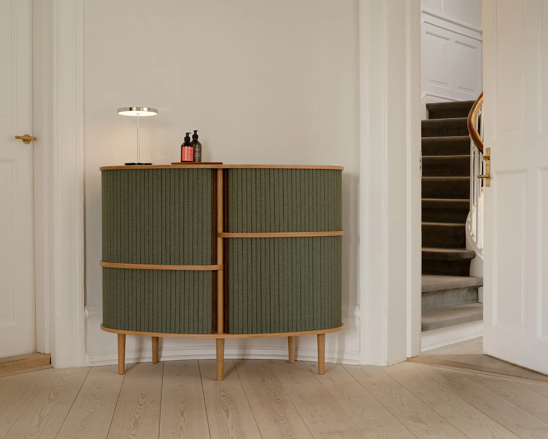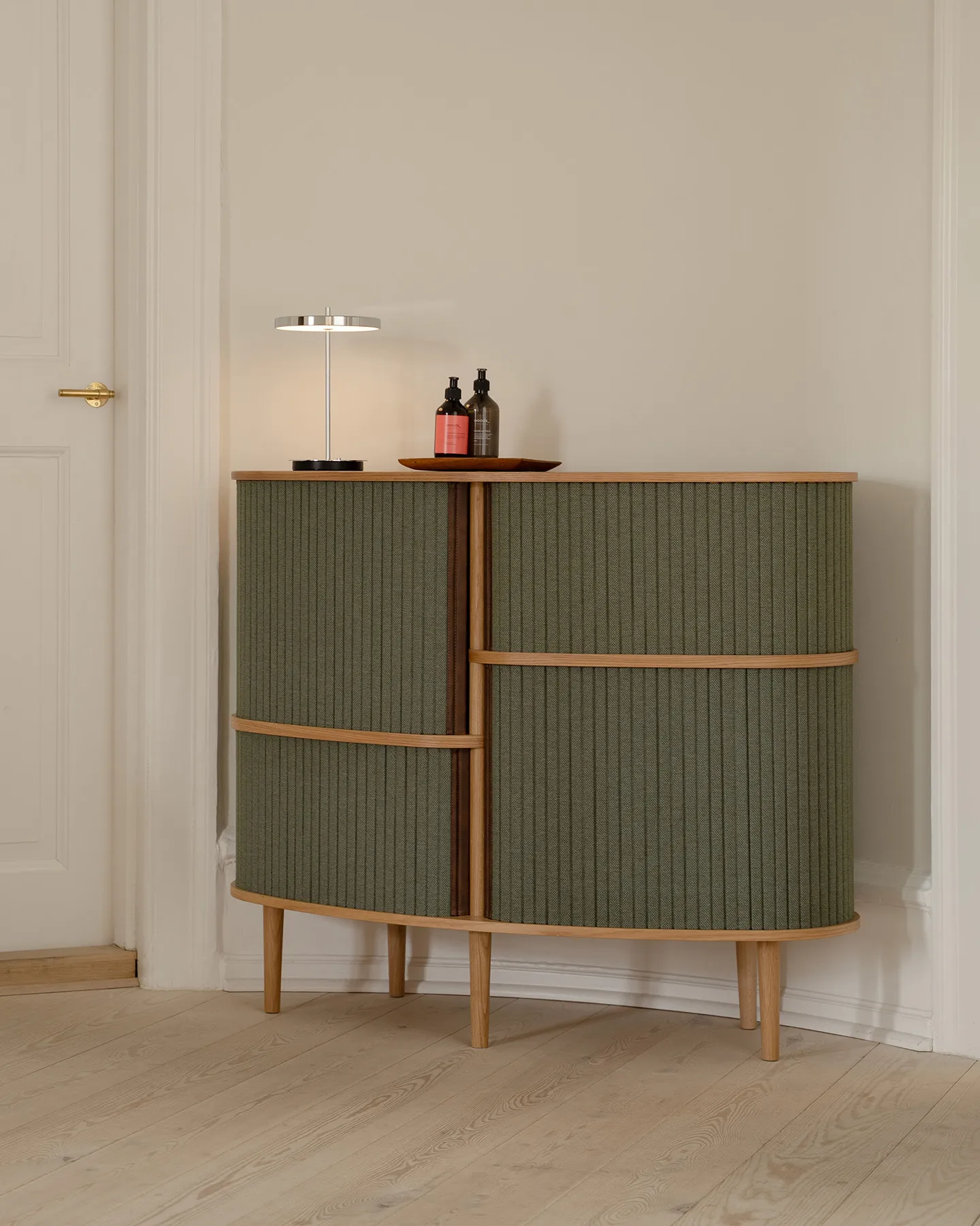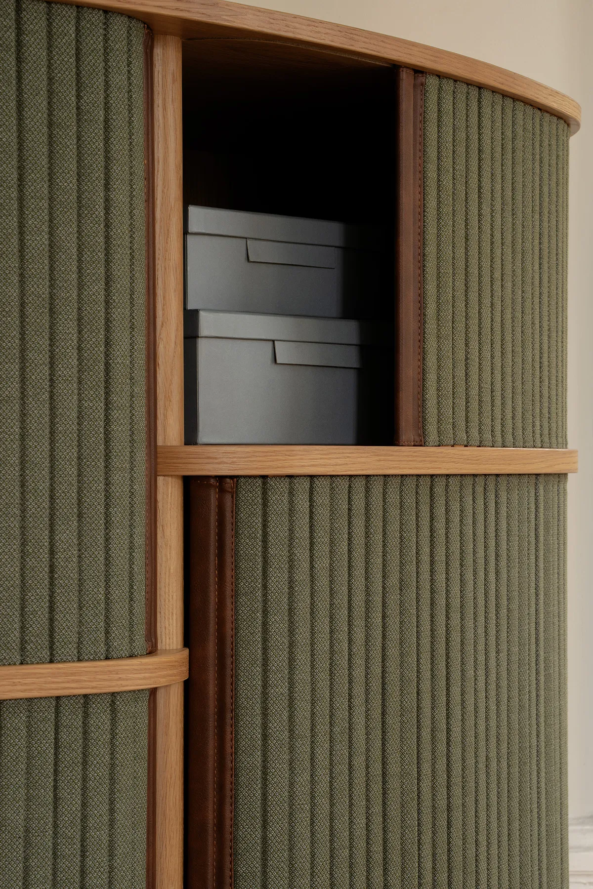 Audacious Highboard är en högre skänk med generös förvaring och böjda skjutdörrar i tyg. En funktionell möbel med varm karaktär – idealisk för matsal, vardagsrum eller hemmakontor.