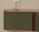 Audacious Sideboard är en skänk med rundad form, skjutdörrar i tyg och justerbara hyllplan. En praktisk lösning för vardagsrum eller kontor, där du vill kombinera teknik, förvaring och ett mjukt uttryck.
