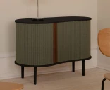 Audacious är en skänk som låter dig visa och dölja – precis som du vill. Skjutdörrarna i textil rör sig längs möbelns rundade form och ger ett mjukt, lugnt uttryck.