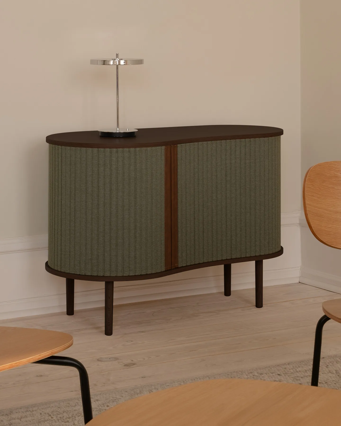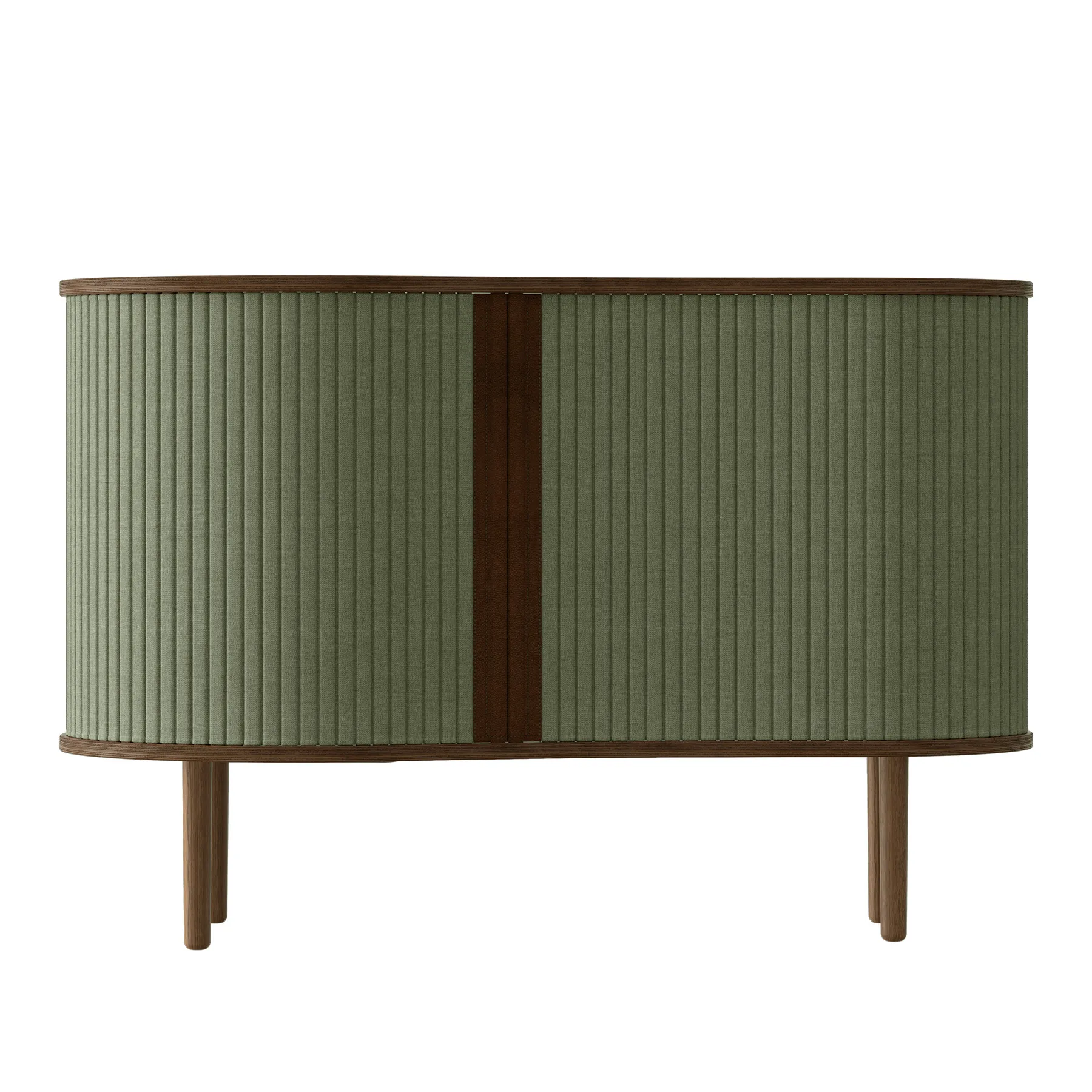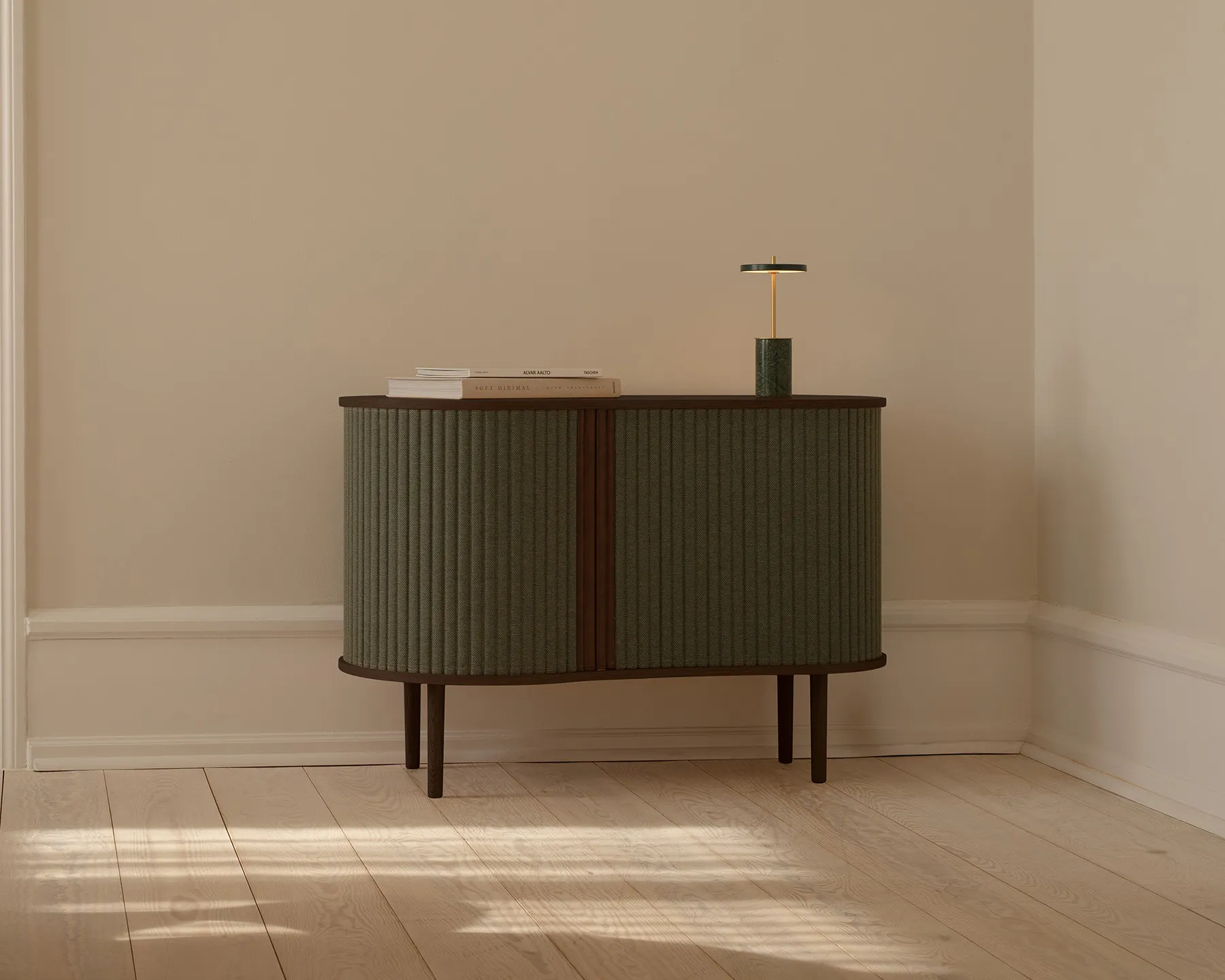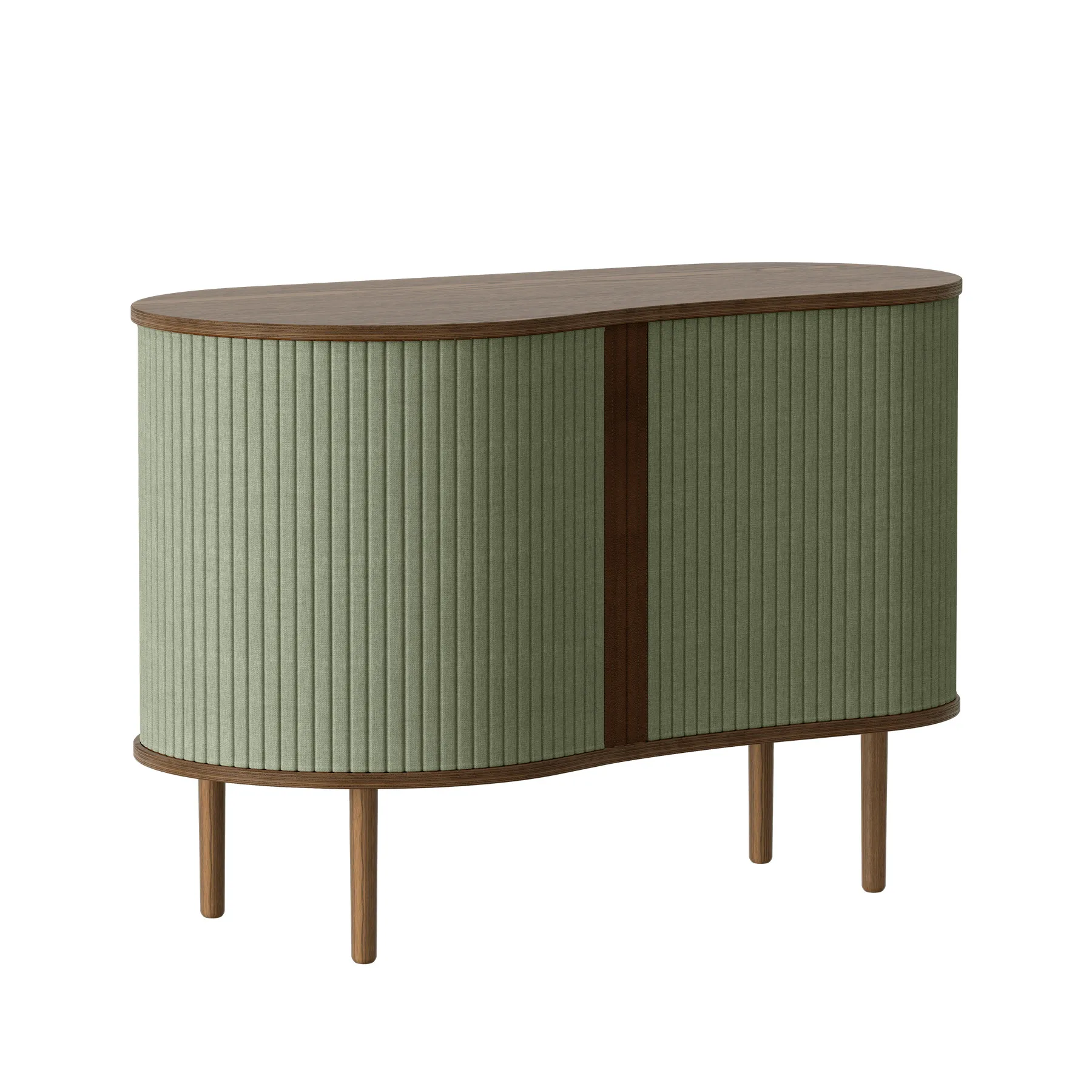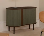 Audacious är en skänk som låter dig visa och dölja – precis som du vill. Skjutdörrarna i textil rör sig längs möbelns rundade form och ger ett mjukt, lugnt uttryck.