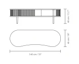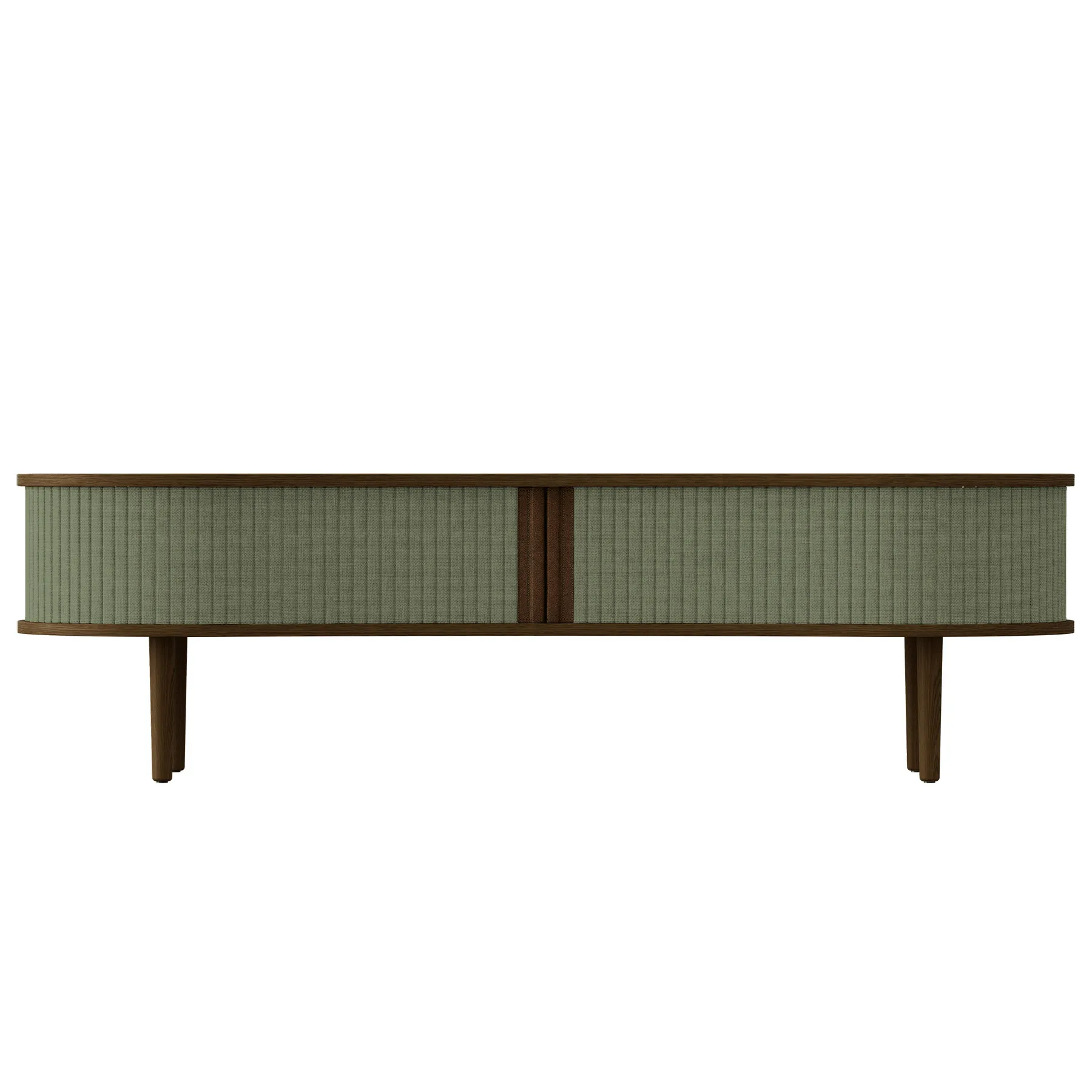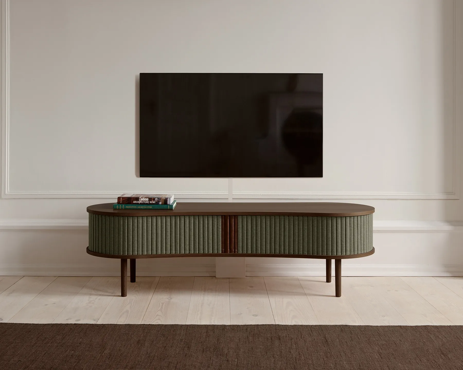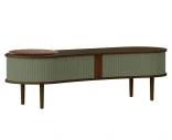 Audacious TV-bänk är formgiven av Jonas Søndergaard och kombinerar förvaring med funktion på ett lågmält och flexibelt sätt. Den rundade fronten med tambourdörrar i textil ger ett mjukt intryck och gör att du själv kan styra hur mycket som ska vara synligt. Möbeln är låg i höjden och lämpar sig väl som mediamöbel under en väggmonterad TV – eller som sittbänk i hallen.