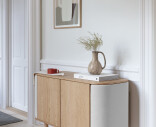 Treasures skänk i ek har rundade sidor klädda med textil, rotting eller konstläder, som öppnas som vingar och erbjuder förvaring för favoritböckerna eller -flaskorna. Dörrarna i mitten av skåpet gömmer rikligt med förvaringsutrymme.