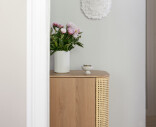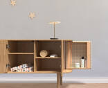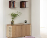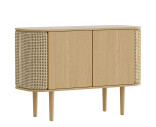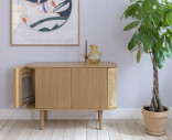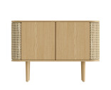 Treasures skänk i ek har rundade sidor klädda med rotting, textil eller konstläder, som öppnas som vingar och erbjuder förvaring för favoritböckerna eller -flaskorna. Dörrarna i mitten av skåpet gömmer rikligt med förvaringsutrymme.