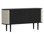 Treasures skänk i svart ek har rundade sidor klädda med textil, rotting eller konstläder, som öppnas som vingar och erbjuder förvaring för favoritböckerna eller -flaskorna. De tre dörrarna i mitten av skåpet gömmer rikligt med förvaringsutrymme.