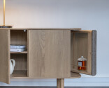 Treasures skänk i ek har rundade sidor klädda med textil, rotting eller konstläder, som öppnas som vingar och erbjuder förvaring för favoritböckerna eller -flaskorna. De tre dörrarna i mitten av skåpet gömmer rikligt med förvaringsutrymme.