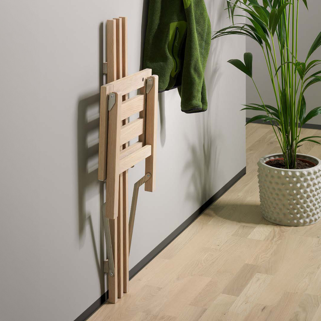 Väggstolen Nadja från Oscarssons Möbel är en utrymmessnål och funktionell möbel som ger dig en extra sittplats när du behöver det som mest. Stolen fälls enkelt ihop mot väggen när den inte används, och tar då minimalt med plats. Den är perfekt för små utrymmen, som hallar, kök och badrum.