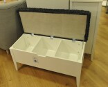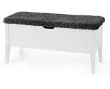Snygg och smart hallbänk med förvaring under sittlocket. Vit bänk med grå fårpälsimitation.