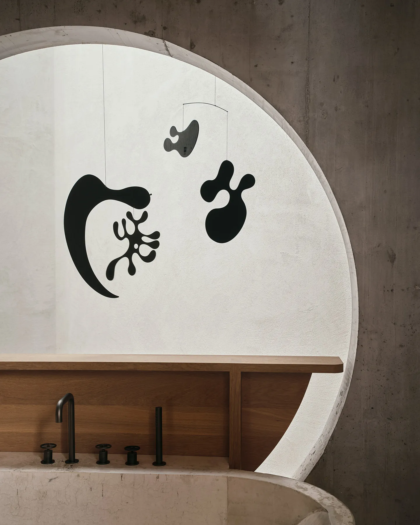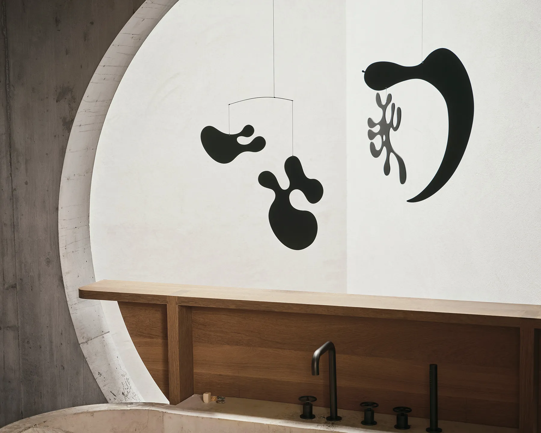 Tillverkad i formpressad flygplansplywood med lackerad yta – välj mellan svart eller isgrå. Mobilen passar lika bra i moderna hem som i kontor, entréer eller kreativa ytor där man vill addera ett subtilt men uttrycksfullt designelement.