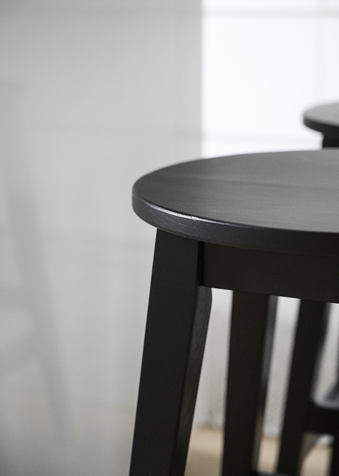 Austin barpall i massiv svartlackad ek med rund sits. Tidlös design som passar i de flesta hem.