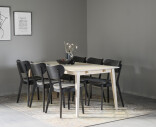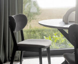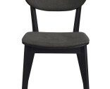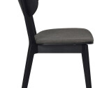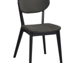 Svartlackad ek trästol, sits och rygg i mörkgrå tyg.