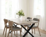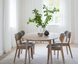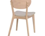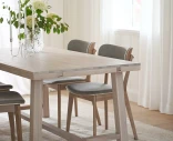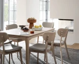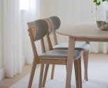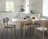 Kato från Rowico är en elegant stol i massiv vitpigmenterad ek med stoppad sits och ryggbricka klädd i slitstark gråbeige textil. Den rundade ryggbrickan ger ett skönt stöd och gör stolen lika bekväm som den är stilren – perfekt för matplatsen där form och funktion möts.