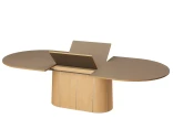 Skovby #115 är ett förlängningsbart matbord där oljad ek möter slitstarkt nanolaminat. Med sin ovala silhuett, den centrala pelarfoten och ett patenterat utdragssystem blir det en självklar samlingspunkt för både vardag och fest.