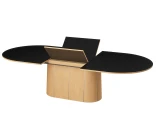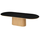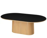Skovby #115 är ett förlängningsbart matbord där oljad ek möter slitstarkt nanolaminat. Med sin ovala silhuett, den centrala pelarfoten och ett patenterat utdragssystem blir det en självklar samlingspunkt för både vardag och fest.