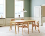 Skovby #140 är ett stilrent matbord i massiv ek med en fast bordsskiva och en distinkt gaveldetalj som lyfter fram träets naturliga struktur. Bordet är designat för att rymma 6 personer och passar perfekt i mindre till medelstora matrum.