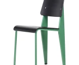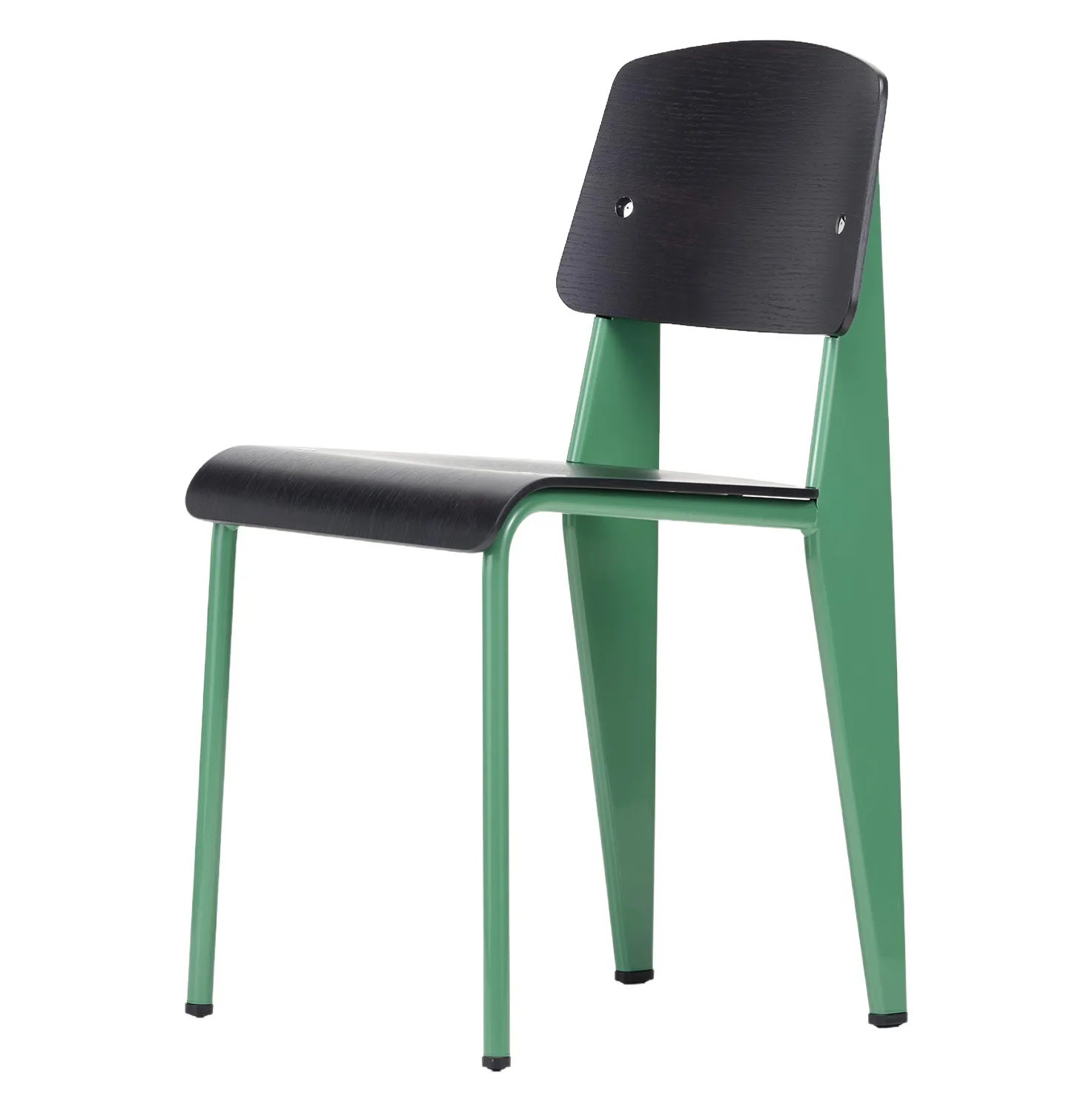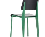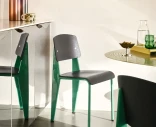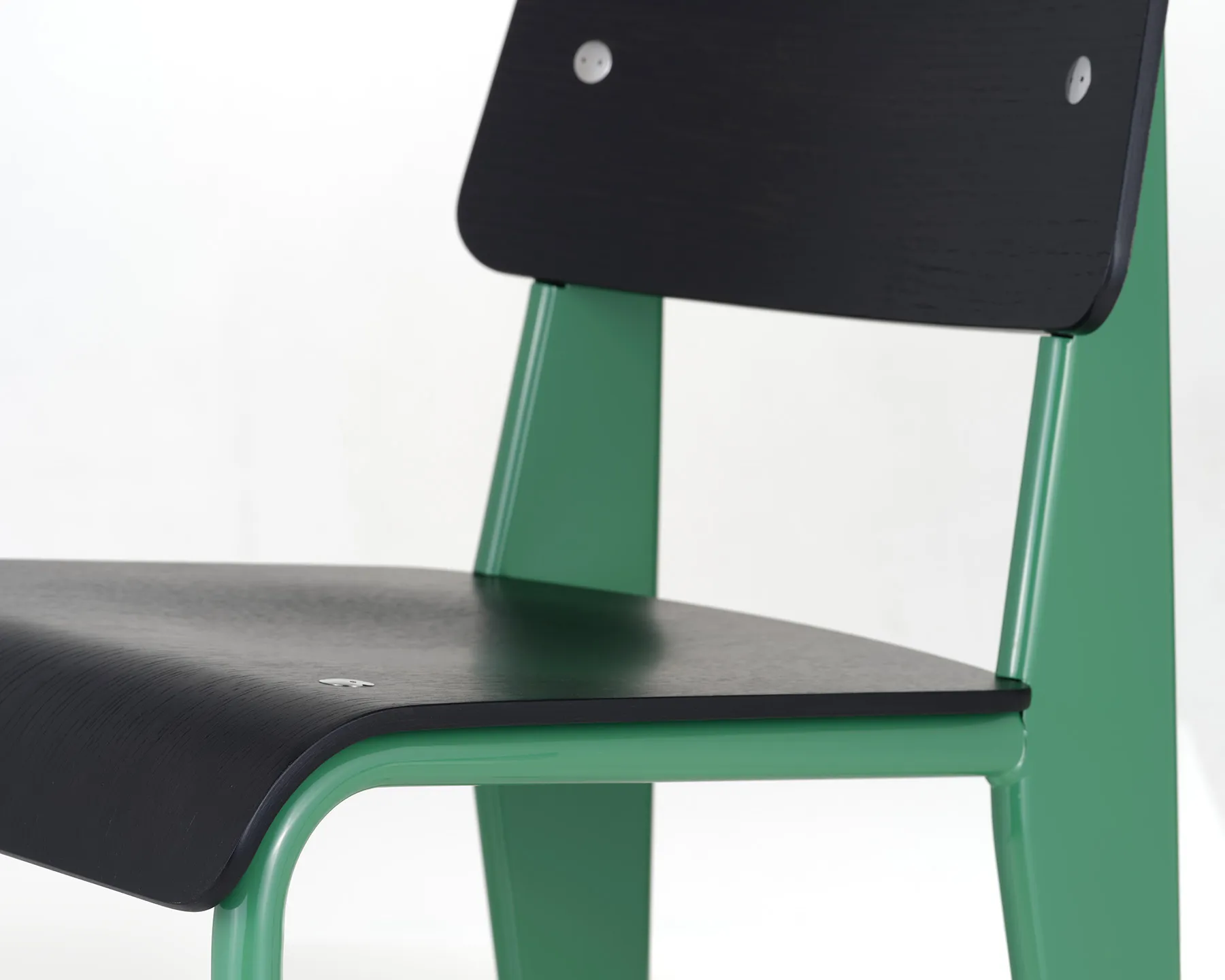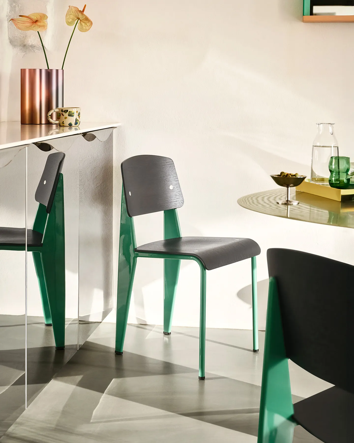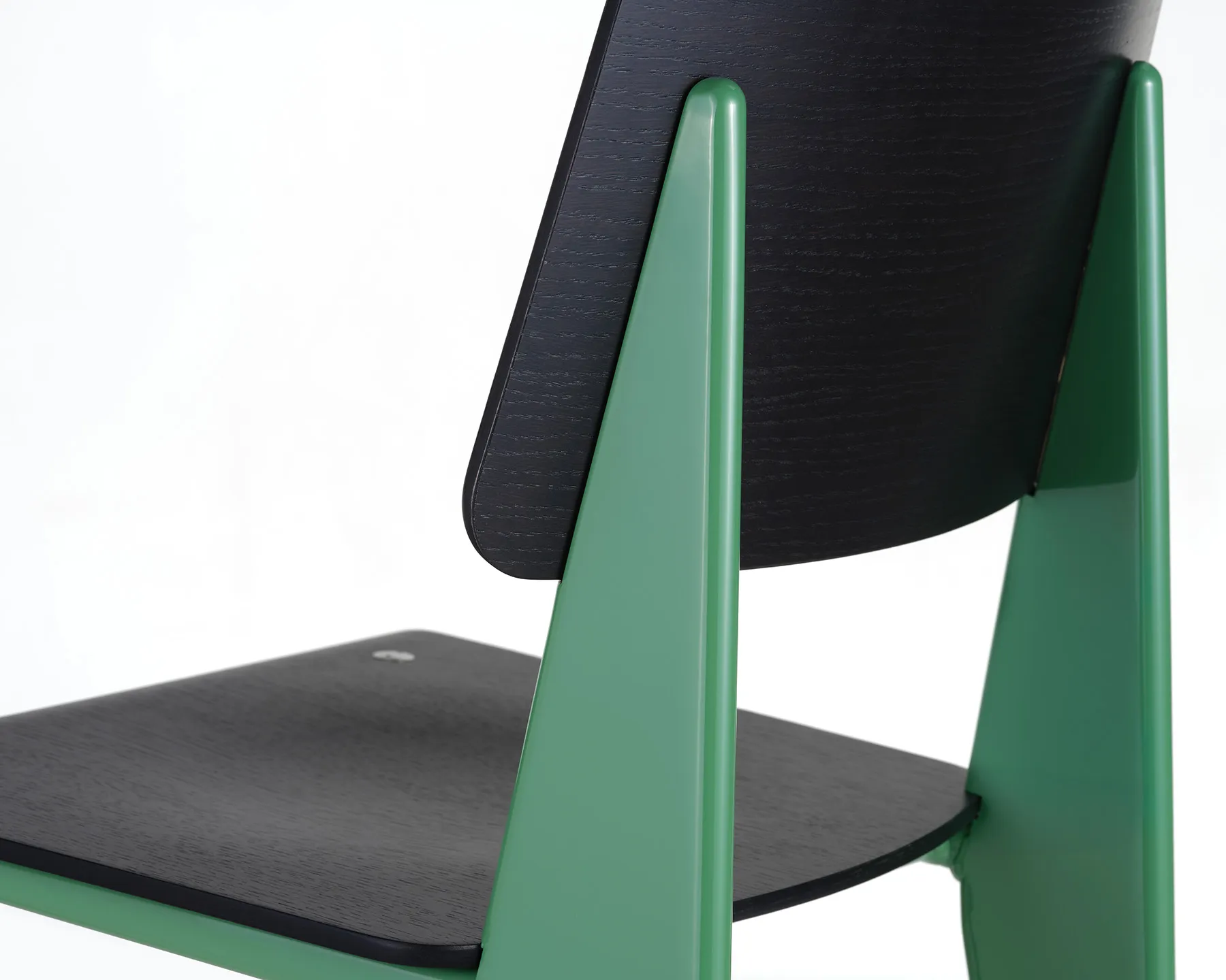 Sits och rygg är tillverkade i lackad mörk ekfanér, vars varma ton kontrasterar vackert mot det pulverlackerade stativet i Prouvé Blé Vert – en grön nyans som togs fram specifikt till Prouvés färgpalett. Standard fungerar lika bra runt matbordet som i offentliga miljöer där hållbarhet och estetik är lika viktiga.