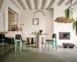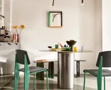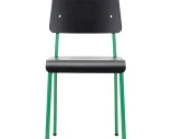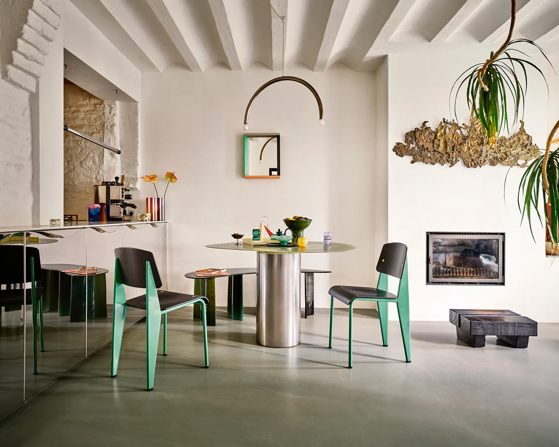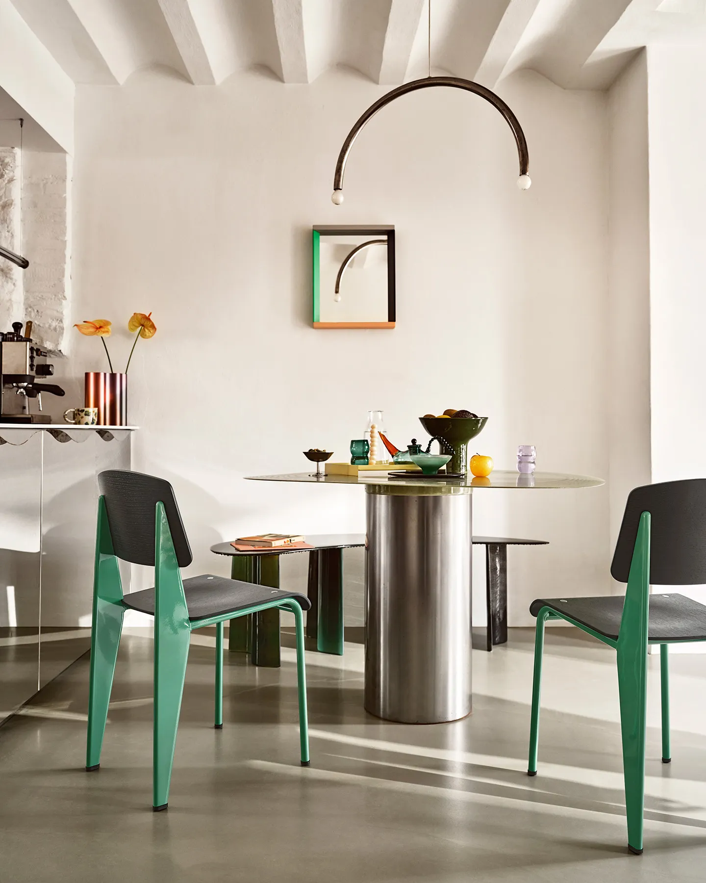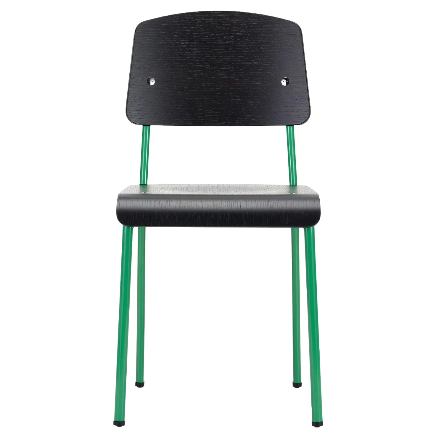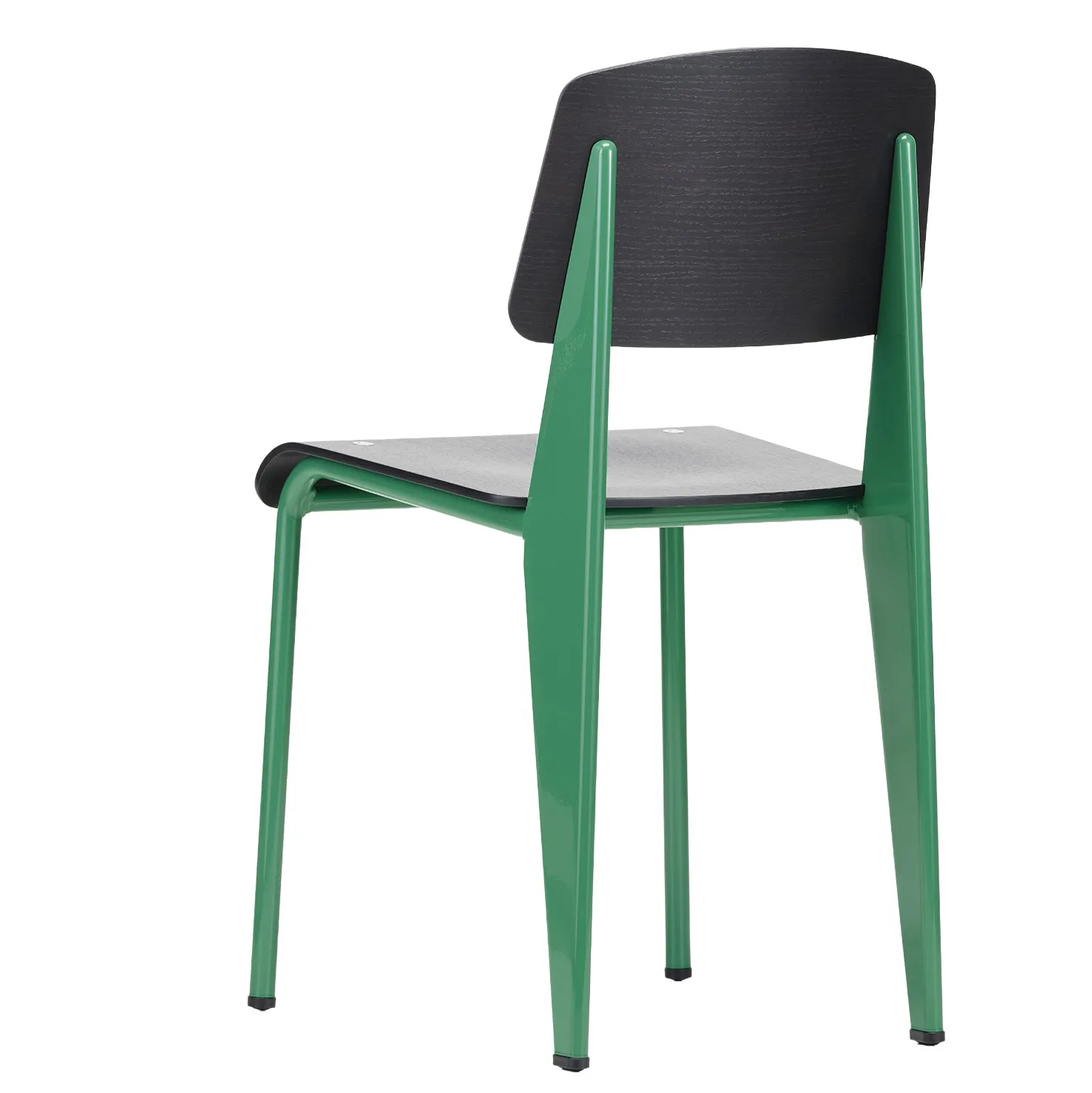 Sits och rygg är tillverkade i lackad mörk ekfanér, vars varma ton kontrasterar vackert mot det pulverlackerade stativet i Prouvé Blé Vert – en grön nyans som togs fram specifikt till Prouvés färgpalett. Standard fungerar lika bra runt matbordet som i offentliga miljöer där hållbarhet och estetik är lika viktiga.