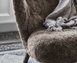 Little Petra soffa med valnötsben och klädd i fårskinn Sahara.