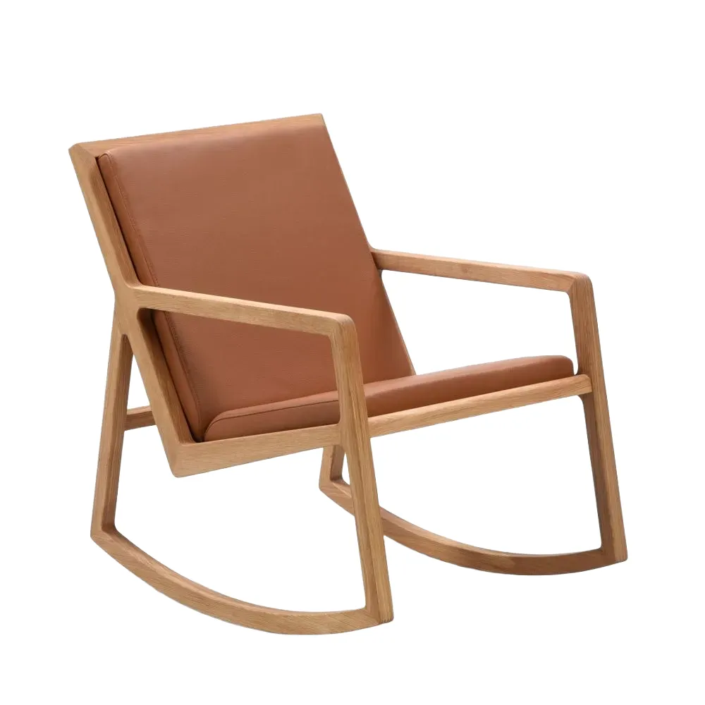 Lux gungstol är en finsktillverkad möbel i massiv ek – formstark, bekväm och byggd för att hålla i generationer. Den oljade ramen lyfter fram träets naturliga ådring, medan klädseln i brunt läder ger gungstolen ett varmt, elegant uttryck. Lädret är slitstarkt och åldras vackert med tiden, vilket förstärker möbelns personlighet och karaktär. Sitsen är generöst vadderad och utrustad med dragkedja för enkel avtagning.