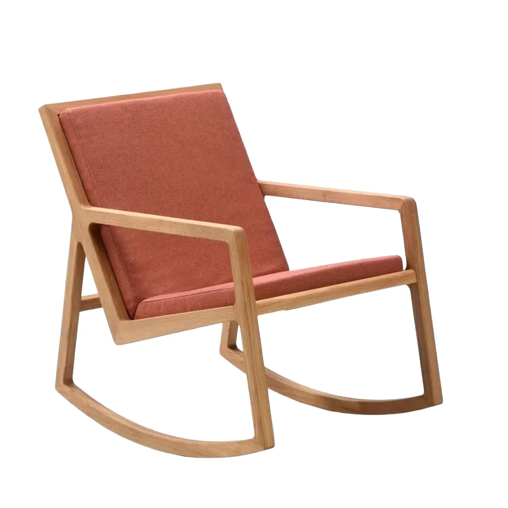 Lux gungstol är en finsktillverkad möbel i massiv ek – formstark, bekväm och byggd för att hålla länge. Den oljade ramen lyfter fram träets naturliga skönhet, medan klädseln i röd Jazz-textil tillför en livfull och varm känsla i rummet. Det slitstarka tyget har en mjuk struktur som bidrar till både komfort och ett uttrycksfullt intryck. Dynan är generöst vadderad och försedd med dragkedja, vilket gör den enkel att ta av vid behov.
