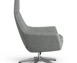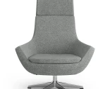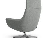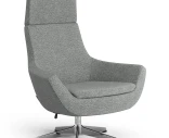 Happy är en del av en familj av fåtöljer, soffor och stolar med samma mjuka, välkomnande formspråk. Just denna modell har hög rygg och ett femstjärnigt snurrstativ i aluminium – stabilt, lättplacerat och olika utföranden.
