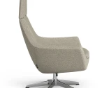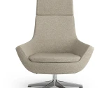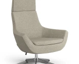 Happy är en del av en familj av fåtöljer, soffor och stolar med samma mjuka, välkomnande formspråk. Just denna modell har hög rygg och ett femstjärnigt snurrstativ i aluminium – stabilt, lättplacerat och olika utföranden.