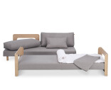 ON2 Wood bäddsoffa från Tapio Anttila Collection kombinerar stilren design med hög funktionalitet. Soffan har rygg- och armstöd i böjd björkplywood och ben i såpbehandlad ek och sits med zig zag-fjädrar för extra komfort. Klädseln är avtagbar och soffans stoppning består av skum och polyesterfiber. Den unika konstruktionen utan mekanismer gör att soffan enkelt kan användas som två separata sängar eller en dubbelsäng.