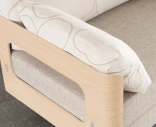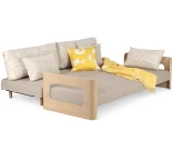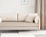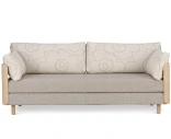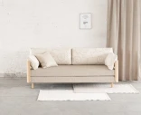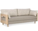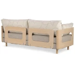 De mönstrade ryggkuddarna innehåller praktiska madrasskydd och bidrar med både funktion och karaktär. Ramen i böjd björkplywood och benen i såpbehandlad ek skapar en stabil grund. Sittdynorna vilar på zig zag-fjädrar för hög komfort. Soffan kan snabbt förvandlas till två sängar i storlek 80 × 200 cm, eller användas som en dubbelsäng.