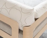 ON2 Wood bäddsoffa från Tapio Anttila Collection i en numrerad specialutgåva med Marimekkos Piirto Unikko-tyg. Soffan har rygg- och armstöd i böjd björkplywood, ben i såpbehandlad ek och en sits med zig zag-fjädrar. Den mekanikfria konstruktionen gör det enkelt att använda soffan som två separata sängar eller en dubbelsäng.